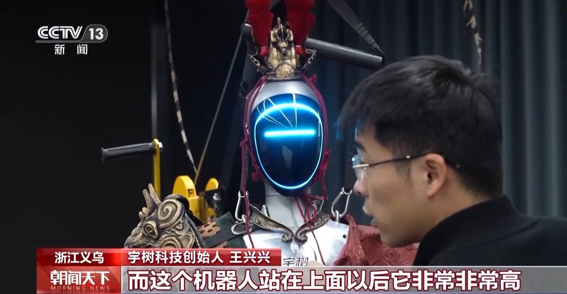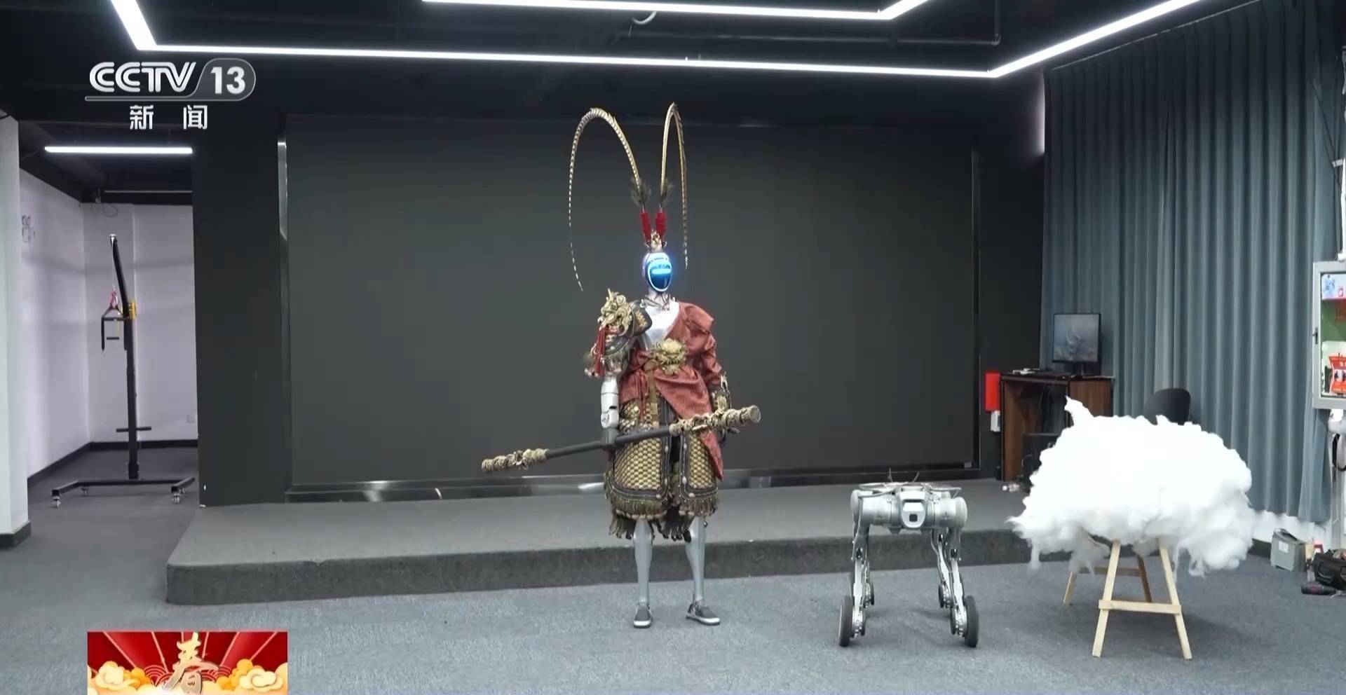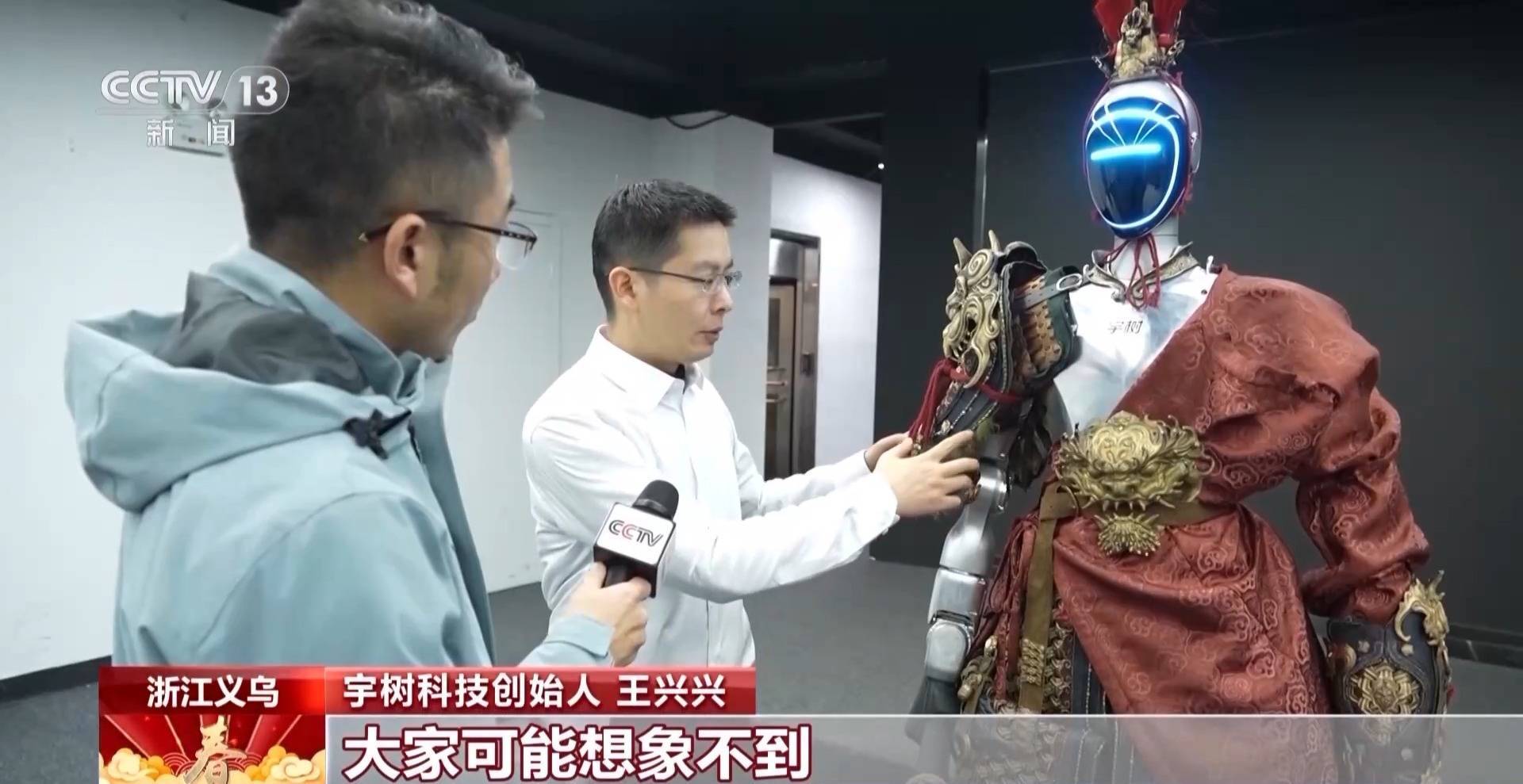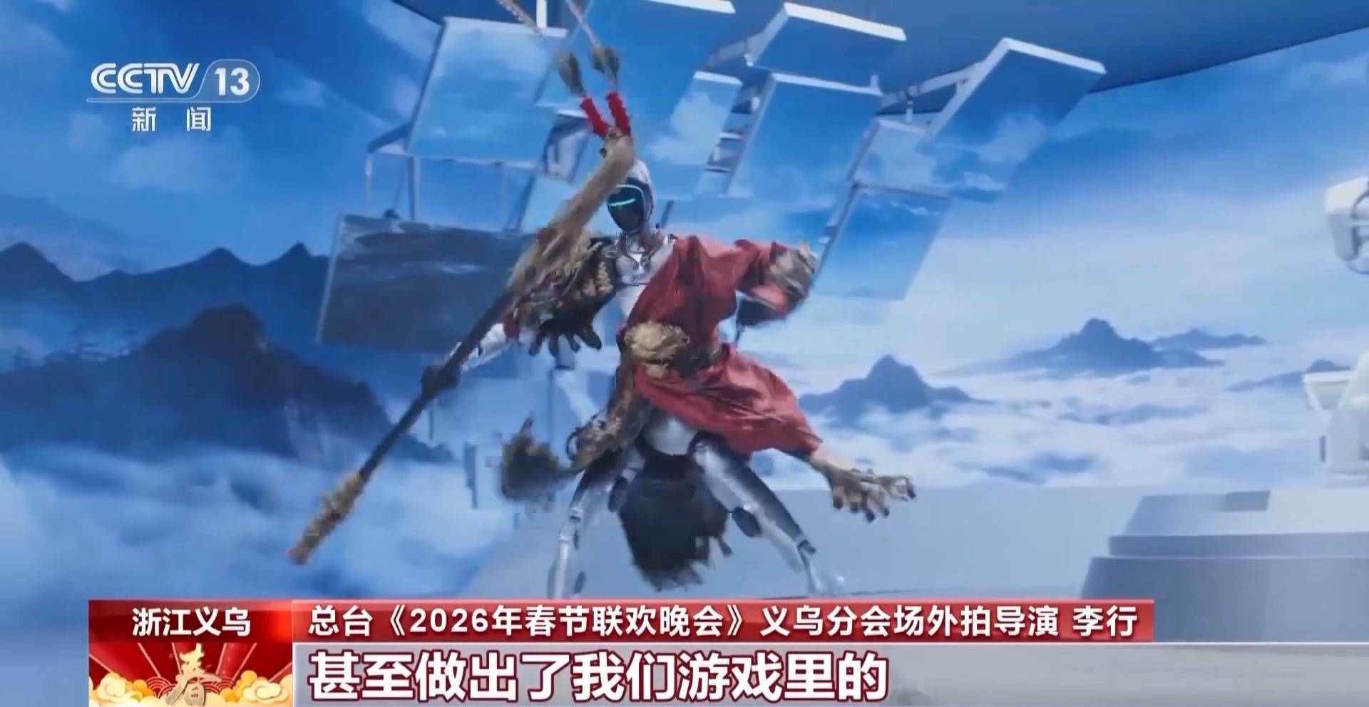 总台《2026年春节联欢晚会》义乌分会场外拍导演 李行:想给科技赋予更多的温度,让机器人穿上我们最熟悉的“大圣”的一套皮肤和盔甲,给所有观众一个惊喜。这个惊喜我们分为两块,一块是把艺人张若昀手里的金箍棒抛到宇树机器人的手里之后,机器人从面部点亮到真的“活”起来;甚至做出了游戏里完美闪避的一连串动作,后半程走的就是温度。
