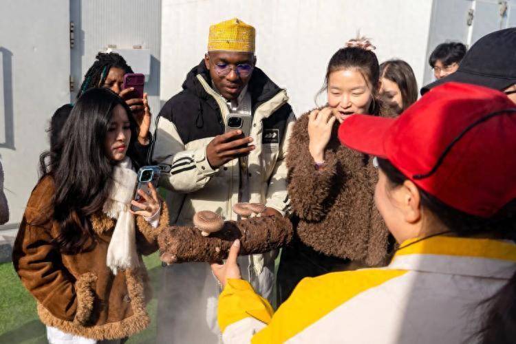 留学生们近距离接触到了生长中的鸡腿菇、银耳、鹿茸菌,从一排排整齐排列的菌包,到萌菌学堂里亲手体验菌种掰碎分装,在实践中直观感受科技赋能现代农业的强劲动能。