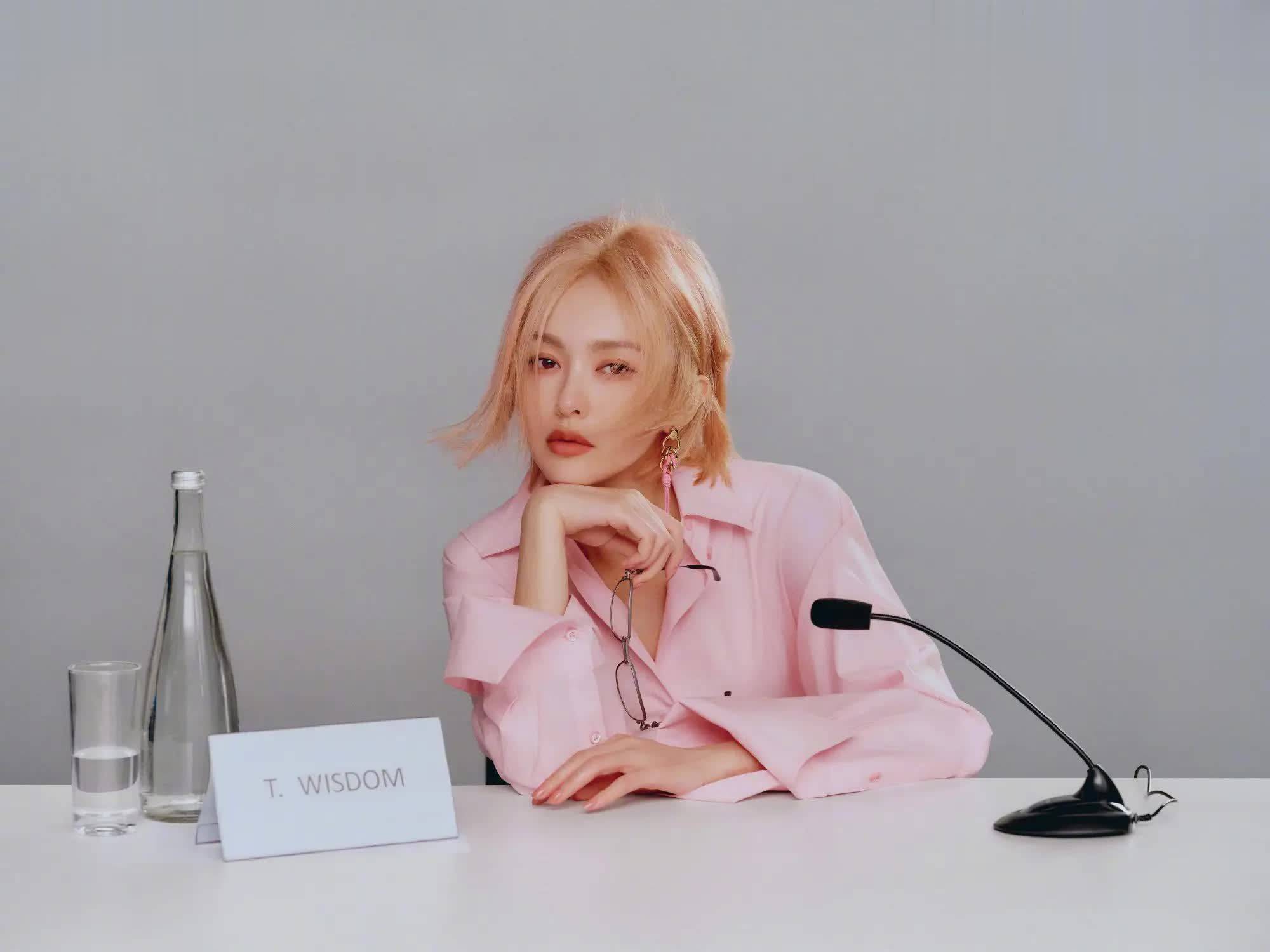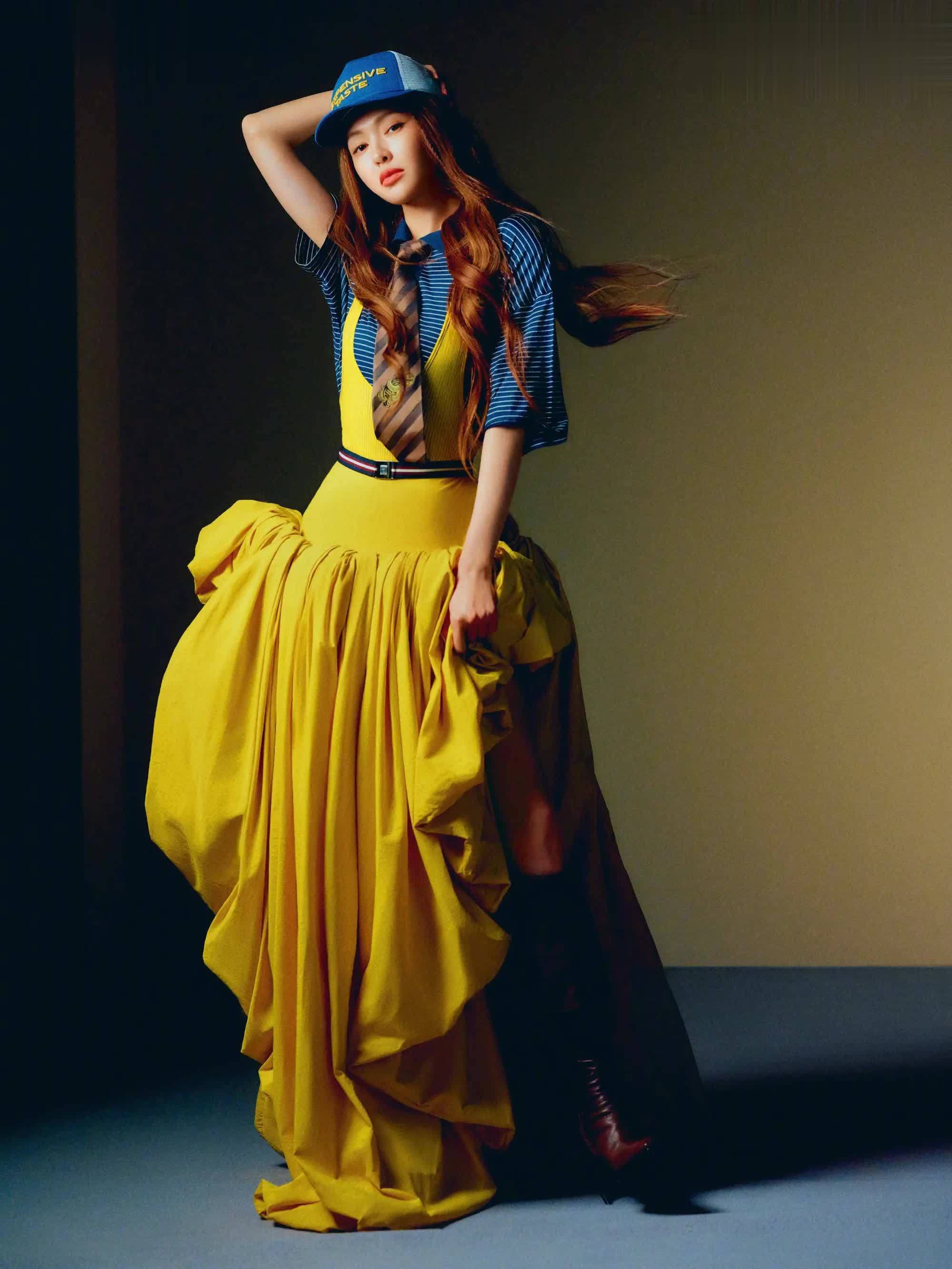 这次封面大片的精华,在于唐嫣对“多面”这个词的完美演绎。封面造型中,冷白皮配上高饱和度的粉发,再架上一副半框眼镜,既有少女的明媚,又多了几分高级的智感,甜而不腻,娇而不嗲。内页里她更是换了七套风格迥异的造型:时而是干练利落的西装女强人,时而是慵懒随性的复古女郎,甚至大胆尝试了将外套当作抹胸穿的先锋穿法。其中一套爆炸头配红色长裙的造型,那份不受束缚的鲜活生命力,直接从照片里溢了出来。